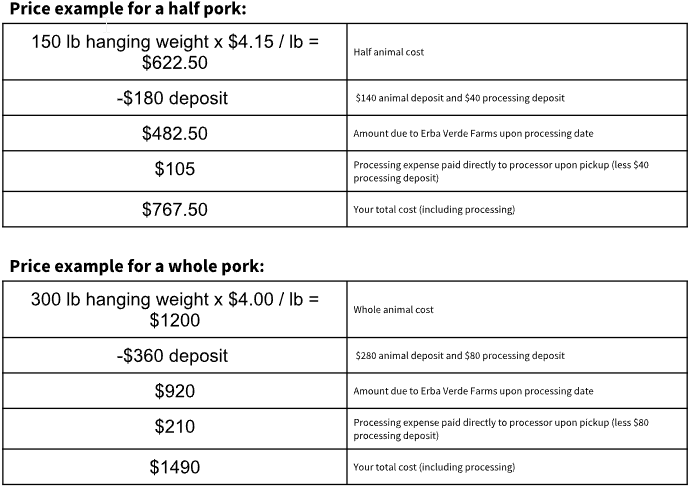 - Bulk pork is sold per pound of hanging weight. This price is for the animal only, and does not include processing. When our processor gives us the hanging weight, we will send you an invoice for the remaining balance to be paid to Erba Verde.